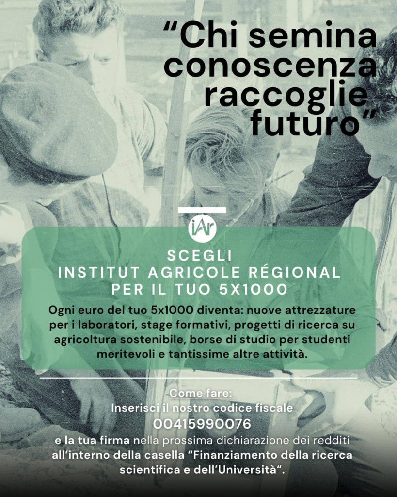 È un gesto che richiede pochi secondi ma che ha un impatto duraturo sulla crescita della nostra comunità agricola. Un investimento nel futuro della Valle d’Aosta; scegliere di destinare il 5×1000 all’Institut Agricole Régional significa credere in un’agricoltura moderna, sostenibile e radicata nel territorio. Significa sostenere giovani che, formati nelle nostre aule e nei nostri campi, contribuiranno a mantenere viva la tradizione agricola valdostana innovandola per le sfide del futuro.